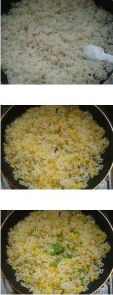 2.平底鍋加油燒熱放入干貝絲炒至酥黃,再將米飯倒入炒散,加入鹽翻炒至米飯粒變干且晶瑩發(fā)亮?xí)r加入蛋液快速炒散,最后撒上蔥花關(guān)火炒勻即可盛到碗里了