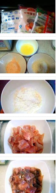 脆炸雞塊的材料:雞胸脯肉,炸雞粉,高粘淀粉,面粉,雞蛋清,面包糠,鹽,味精,黑胡椒粉,料酒