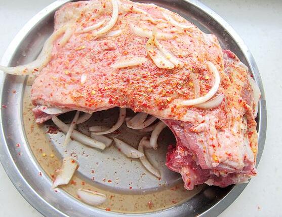 1.把羊排切好要的份量去邊邊,用叉子把羊排扎上好多小孔,把洋蔥去皮切絲,把洋蔥絲辣椒粉孜然粉胡椒粉鹽加少許水一起拌均勻