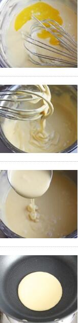 4. 取一個(gè)不粘鍋,小火,預(yù)熱一會(huì)兒后舀一勺面糊入鍋中心,當(dāng)面餅表面出現(xiàn)一些小孔,翻面煎,翻面再煎30秒左右,視底部中間顏色略深即盛出。