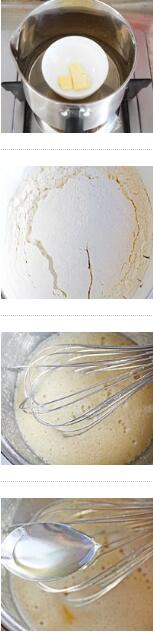 1. 黃油放入小碗中,隔熱水小火加熱至融化,將低筋面粉過篩。