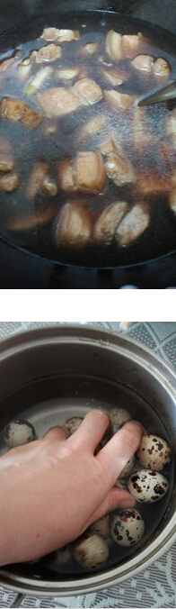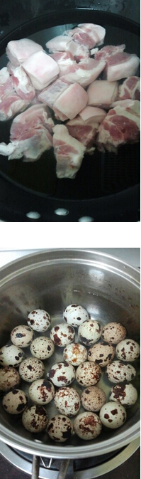 1.五花肉焯水,鵪鶉蛋洗凈放鍋煮熟,可以放一點鹽進(jìn)去,這樣煮的時候不容易破。
