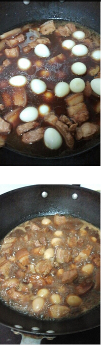 5.肉燒到半小時左右放入鵪鶉蛋,燒開后轉(zhuǎn)小火,再燒20分鐘左右,用筷子插肉,能輕輕穿透后,用大火收汁,撒上蔥花,裝盤。