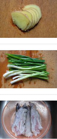 1.姜片洗凈,切片待用,蔥段洗凈,切成小段,,豬手去除雜毛,洗凈備用