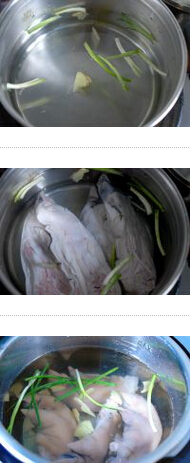 2.清水注入干凈的鍋中,放入蔥段、姜片、料酒,燒開,水滾后,放入豬爪,燒制5-10分鐘,充分去除水,洗凈 怎么做好吃