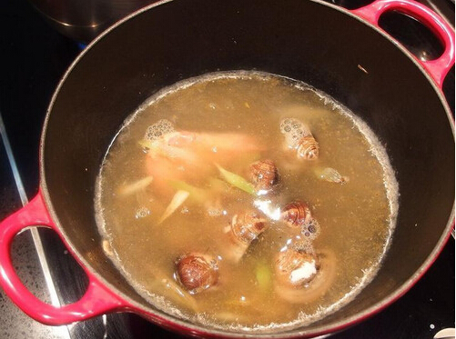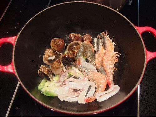 3、使用一個湯鍋放入一匙油熱鍋后,加入蔥白爆香,再將海鮮及蛤蜊全都下鍋拌炒,炒至海鮮約9分熟時,先起鍋放一旁備用,亦可留一半的海鮮在鍋里,可增添濃郁的風(fēng)味,加入高湯煮滾。