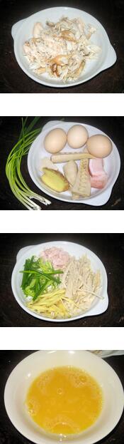 桂花蟹肉的材料:螃蟹肉150g,雞蛋3只, 冬筍100g, 肥豬肉,
