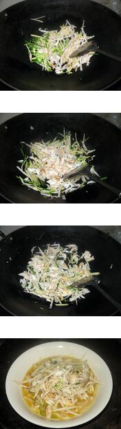 3.坐鍋倒油,將鮮筍、肥肉、姜蔥下鍋煸香,加入準備好的蟹肉,鍋里的所以材料炒熟盛出。