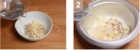 2. 在碗中將南杏,薏米和水混合,泡15分鐘。