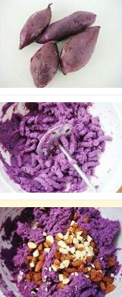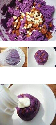 1.紫薯洗凈放鍋里蒸10分鐘,去皮,切小塊,紫薯里加煉奶和蜂蜜搗成泥,干果切碎,把碎干果和葡萄干放紫薯泥里攪拌均勻 怎么做好吃