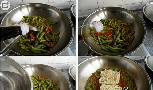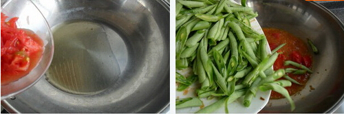 3、炒鍋熱油,放入西紅柿塊煸炒出湯汁,然后放入豆角段炒至斷生。
