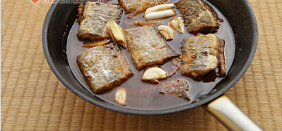 4、帶魚不用出鍋,放入蔥、蒜、倒入料酒、糖醋汁烹香,倒入適量溫水燜燒約10分鐘。