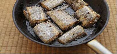 2、用廚房面巾紙將帶魚擦干凈,平底鍋倒少許油,放入花椒炒香,放入帶魚煎至兩面金黃。