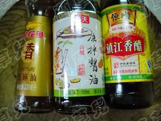 3 準(zhǔn)備好香醋、涼拌醬油、芝麻油。