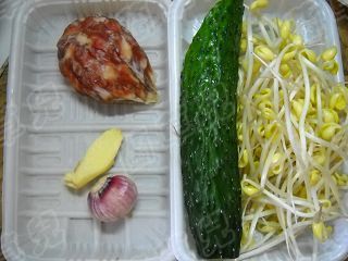 4 準(zhǔn)備好黃瓜、豆芽、香肚、姜蒜。