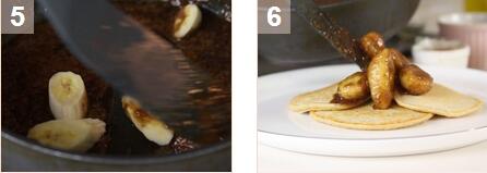 4.以中火熔化牛油,黃糖,玉桂,豆蔻及楓樹糖漿至完全熔化及攪勻成醬汁,加入切片的香蕉,并混入醬汁,混入蘭姆酒,然后將香蕉及醬汁放于班戟上再撒上喜歡的果仁就可以開吃了!