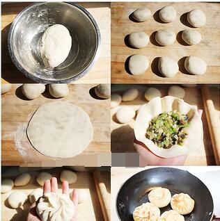 3.取一份搟成圓餅,將兩大匙餡料放在中間,包成包子狀即可