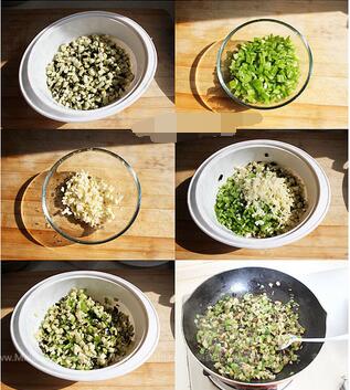 2.茄子丁、尖椒碎、蒜末混合加鹽、白糖、生抽和一大匙花生油拌勻,將拌勻的餡料用平底鍋小火炒至茄子變軟怎么做好吃