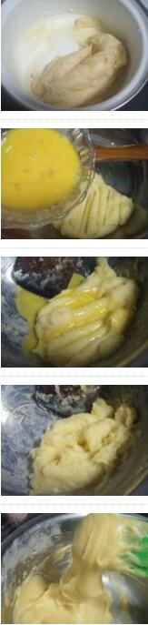 1.黃油軟化與水混合,用小火煮至沸騰,立即離火,然后篩入低粉,用木鏟翻拌至無干粉,再用小火煮至水發(fā),邊攪拌成團鍋底有一層薄薄的膜出現就關火,然后把面團倒在另一個碗中