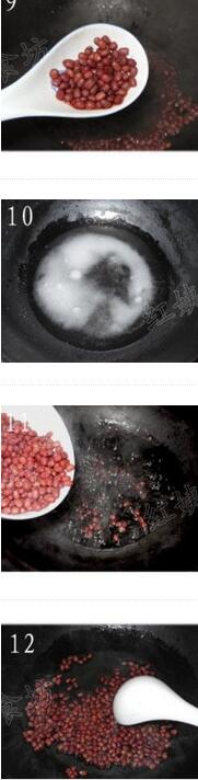 4. 鍋中倒入白糖,在加入冷水,大火開始熬,熬至湯汁產(chǎn)生粘性,改為小火,防止湯汁變苦,把紅豆倒進去,不停的用勺子翻炒紅豆,讓每一個紅豆都均勻的裹上糖份(這樣不僅粒粒紅豆都有甜味,還可增加粘性,利于成型)。