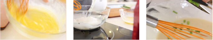 1. 將一只雞蛋打入碗內(nèi)。用另一只攪拌碗混和面粉、粟粉及水,打發(fā)均勻,將蛋液倒入面糊拌勻,加鹽調(diào)味,再加入蔥花混和 學(xué)做菜