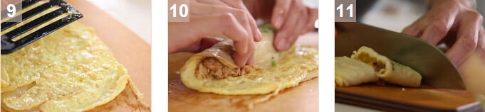5. 當(dāng)?shù)凹迨欤训帮灧派系懊?,在中間鋪上肉松,然后卷起蛋餅,最后,將蛋餅卷切小段就可以吃了