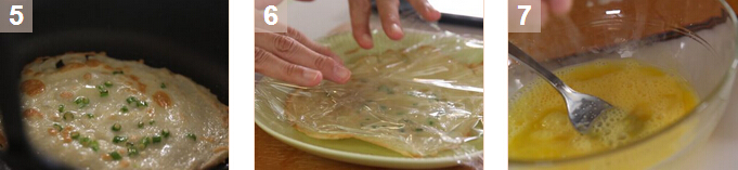 3. 將蛋餅放在碟上,并重覆步驟3將余下的面糊制作完成。在兩塊蛋餅之間鋪上保鮮紙,以防止兩塊蛋餅黏著。放在一旁備用