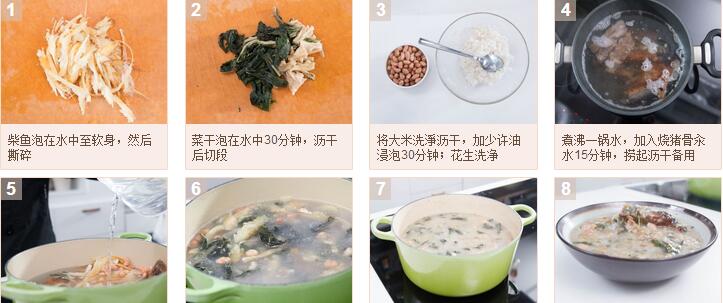 柴魚生菜干豬骨的材料:大米100g,燒豬骨300g,花生100g,菜干50g,柴魚1條,鹽,胡椒粉