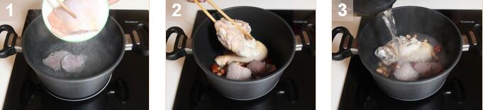 1. 煮滾一鍋水,加入豬肉和雞高火出水3分鐘。取出瀝干。