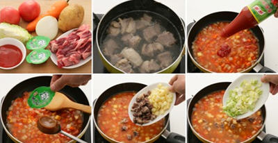 2. 洋蔥、番茄、胡蘿卜和土豆洗干凈后切塊,下鍋煸炒,加入家樂番茄沙司和牛肉湯煮。