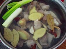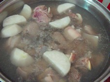 1 冷水放羊肉蘿卜,一起燒開煮一會,到很多臟末出來,撈出羊肉洗凈,蘿卜丟掉。