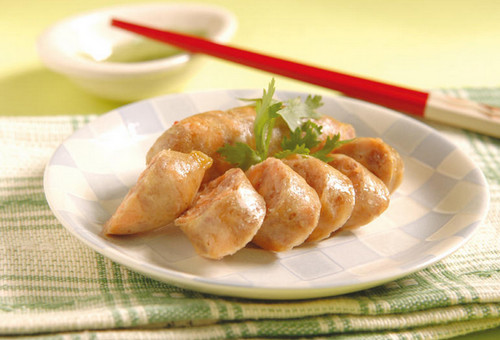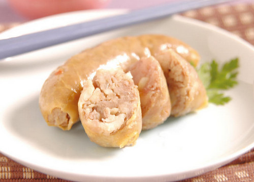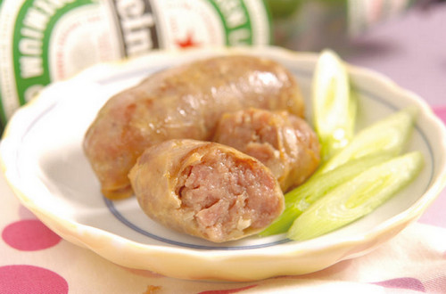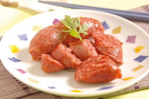 攪拌后的肉餡可先甩一甩,以增加彈性和黏性,灌香腸時千萬不要因為貪心而將材料塞太滿,以免一放入油鍋油炸就會露餡了!放入油炸時可在冷油就將香腸先行放入,如此一來可以避免香腸外表燒焦、里面不熟的失敗,且油炸時要開小火慢慢炸到表面逐漸呈金黃色就可以上桌,不過現代人講求健康料理法,因此我們也可以用家里烤箱160℃先預熱3分鐘,再將香腸放入烤10分鐘即可,或直接用電鍋蒸熟,也不失為一好料理方法喔!自己作出來的香腸色澤并不像市面販賣的香腸紅潤,那是因為強調不添加亞硝酸鹽,但是100%健康安心的保證喔!