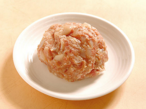 1、先將鮭魚去皮及外緣的刺,用手仔細觸摸去掉刺,再洗凈瀝干水份后切丁,與絞肉攪拌均勻備用。