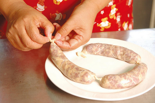 8、作法7灌好的香腸取每一段平均長度,并在香腸之間留約5—10公分空隙轉起成節(jié),并于最頭端部分打上死結防止肉餡露出。