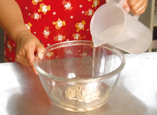 5、將腸衣浸泡冷水30分鐘,讓腸衣變軟并去除內含的鹽分備用。