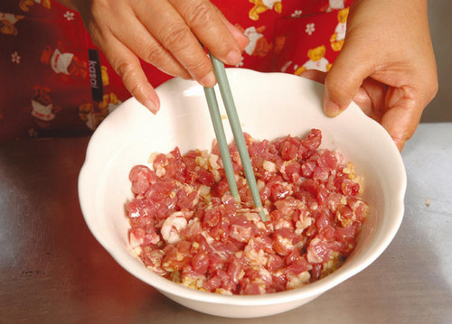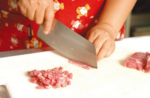 切肉時也可以換切成大塊來增加咬勁口感,如果怕麻煩可全部買絞肉以節(jié)省時間,如果選擇的肉比較瘦,另外加入一些比例的肥肉,吃起來口感更加順口也不會太干澀喔!