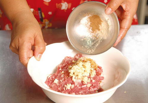 3、將作法1的豬肉末放入大小適中的容器,加入作法2的蒜末及所有調味料一起攪拌均勻。