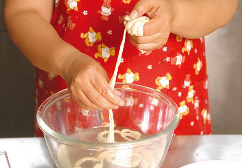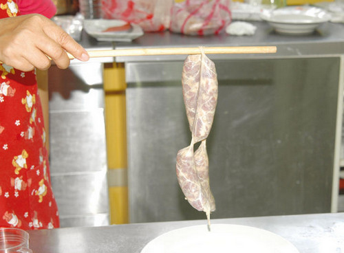 6、取出作法5的腸衣,用手由上往下瀝干,再用紙巾將多余水份吸干。