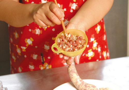 7、取作法6的腸衣開口套在漏斗上,并用筷子將作法4的內餡灌入,并一邊用手將其往下推,重復此動作至材料用畢。
