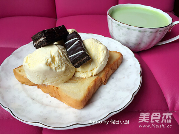 2.用勺子將冰激凌挖出成球狀放在面包上。放上巧克力威化餅干即可