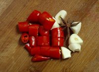 7.加干黃椒、八角、蒜丁、鹽炒勻。