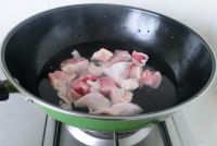5.鍋中加入油,放入八角、花椒炸香,再放入姜、蔥末炸香放入雞肉翻炒,加入料酒翻炒