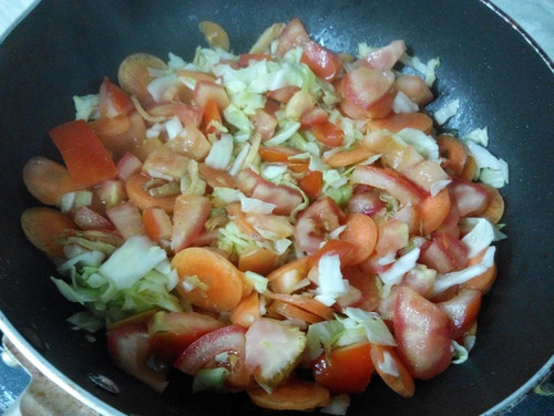 3、倒入切好的紅番茄、紅蘿卜、高麗菜葉,一起炒三分鐘。