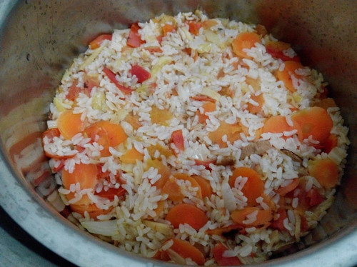 6、將炒好的白米和蔬菜倒入飯鍋。因為有蔬菜,所以加的水不必滿一杯。蒸十到十五分鐘左右。