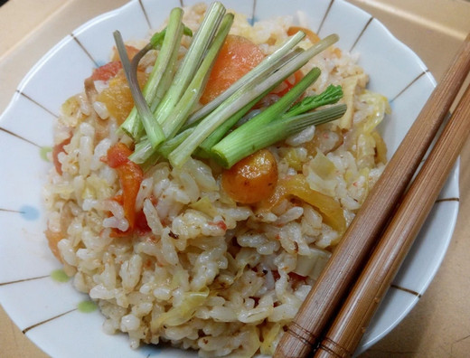 胡蘿卜番茄蒸米飯是用簡單的加姜炒熱的方法,讓家常好處理的番茄、蘿卜、高麗菜都能散發(fā)出自身的天然菜香。炒熱的白米易于蒸熟,也更能吸收蔬菜精華。用萬能電鍋將所有米菜一起蒸煮。煮熟后加點麻油,即能使用。也可拌點枸杞、葡萄或堅果。
