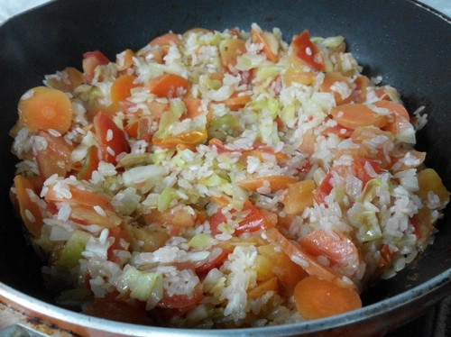 5、拌炒白米和紅番茄、紅蘿卜、高麗菜葉,加一些鹽、醬油、麻油。拌炒五分鐘。