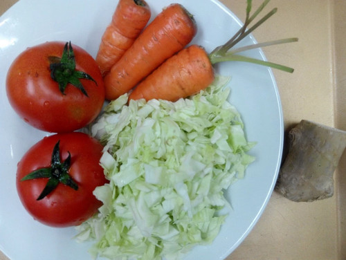 1、有機紅番茄,切小片; 有機紅蘿卜,切片、切絲、切丁,皆可; 有機高麗菜葉,切絲; 姜,切絲。