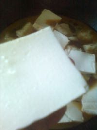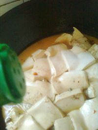 11.燜至魚塊八成熟,手托豆腐,縱的用刀在豆腐中間一刀,再橫的將豆腐一一切塊,不要?jiǎng)隅P子,直接加蓋燜燒