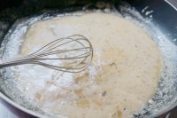 2.將黃油及面粉放在鍋子中拌均,一定要小火,要不就會糊會變的顏色很深。拌勻后裝起放在一邊晾涼