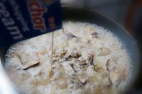 6.沸騰后加入黃油糊攪拌均勻,再將鹽、黑胡椒、淡奶油放入。小火煮30分鐘后裝盤、再把西蘭花跟豌豆點綴上面,再將淡奶油劃圈式手法倒入適量即可~。